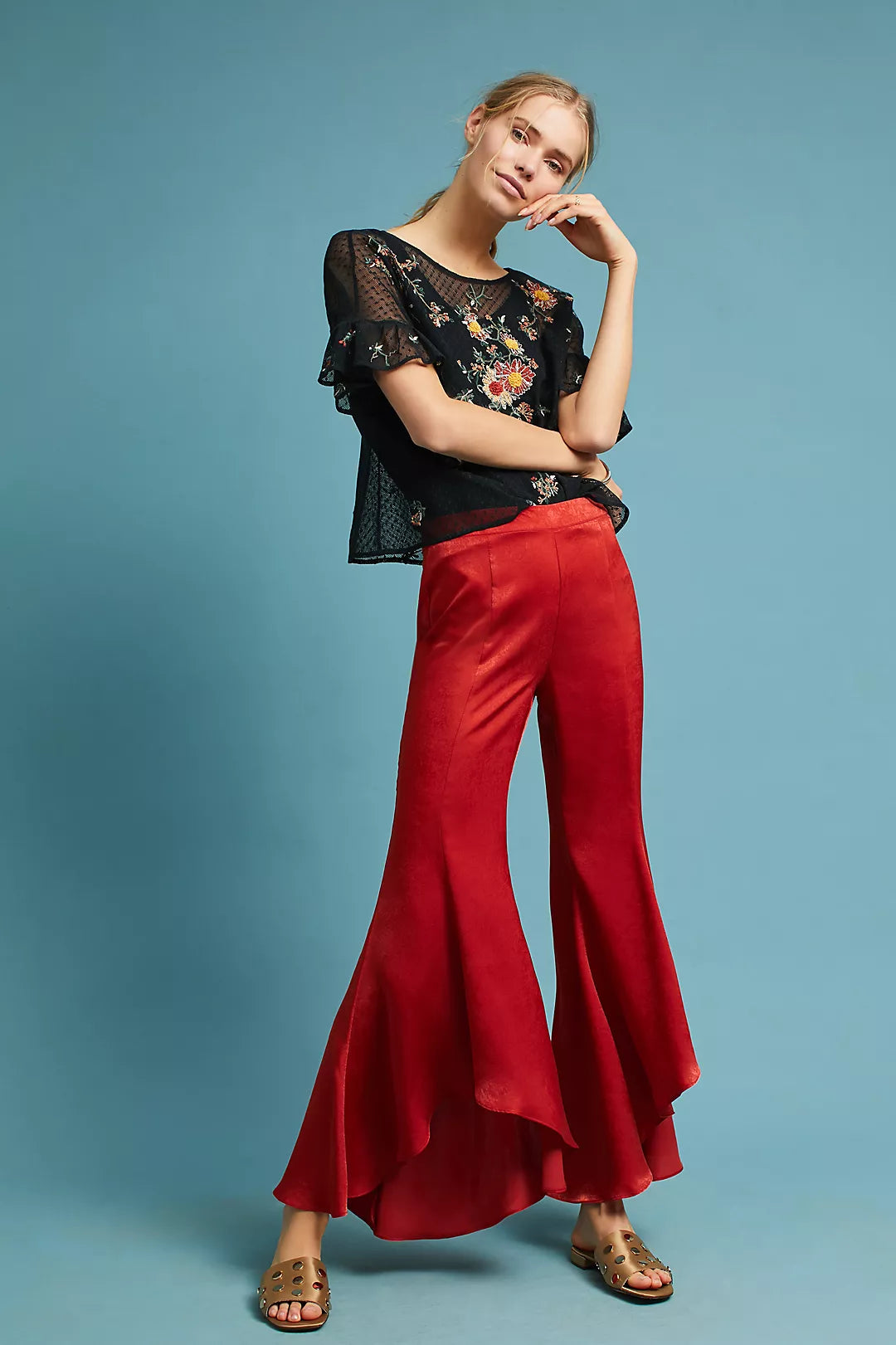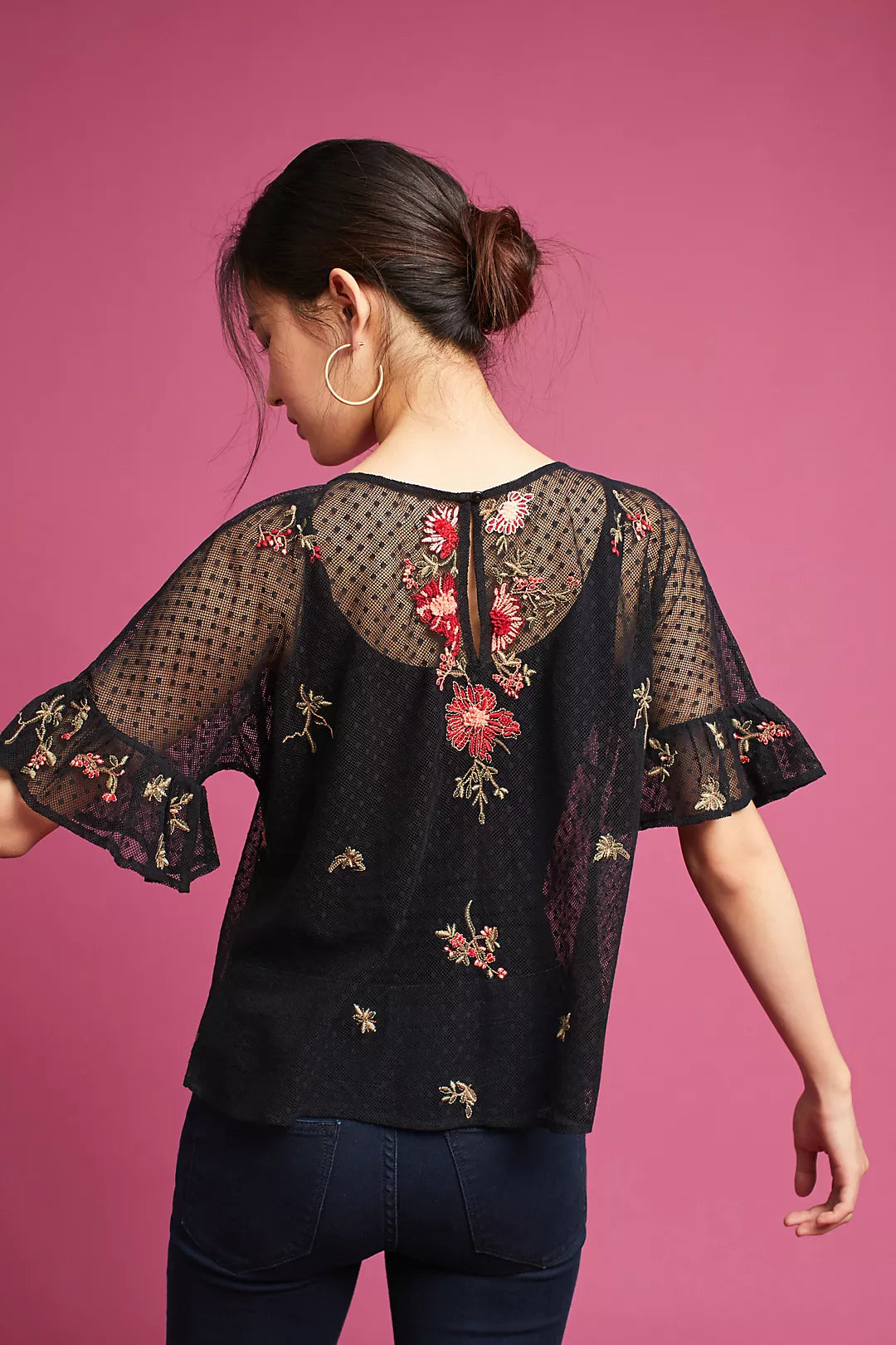 Anthropologie Black Mesh Floral Embroidered Blouse, Size S